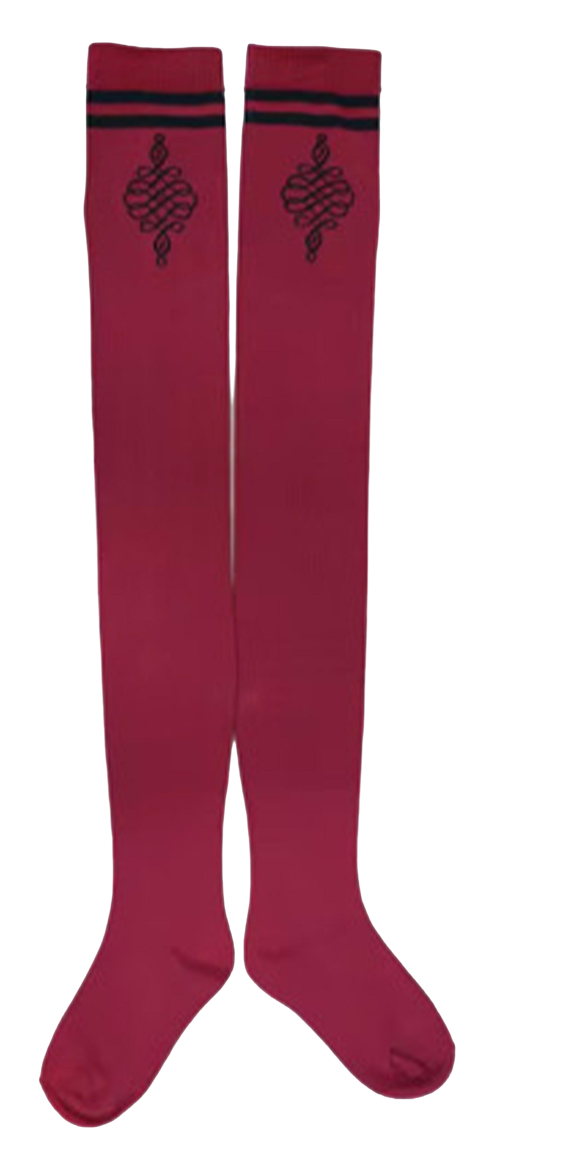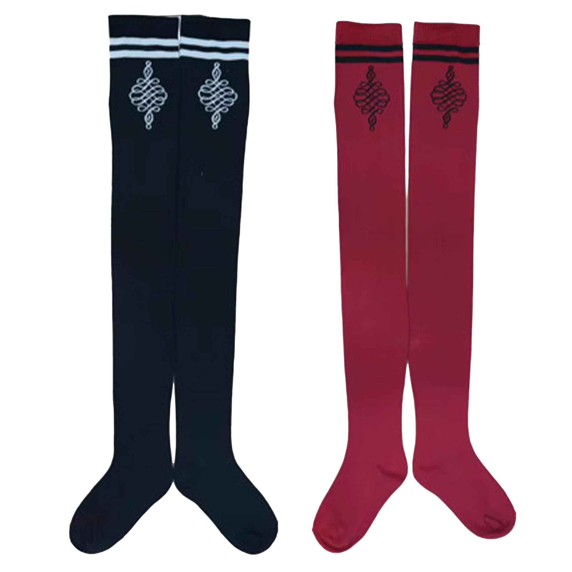 Knee-length socks featuring dual horizontal stripes at the cuff and a centered ornamental logo on the upper leg.